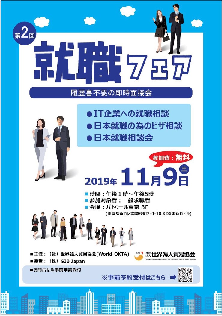 이번에 개최되는 ‘제2회 취업박람회’에서는 IT업계 취업에 관심이 높은 점을 고려해 IT업계로의 전직 및 취업 상담을 포함해 일본 취업에 대한 상담회가 예정돼 있다. 또한 호텔, 관광, 무역, 미용 등 다양한 업종의 회원기업 10여곳이 취업상담 부스를 운영할 예정이다.